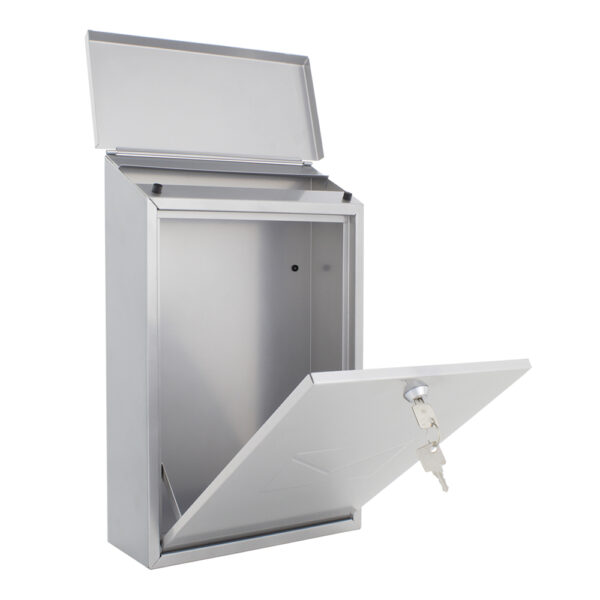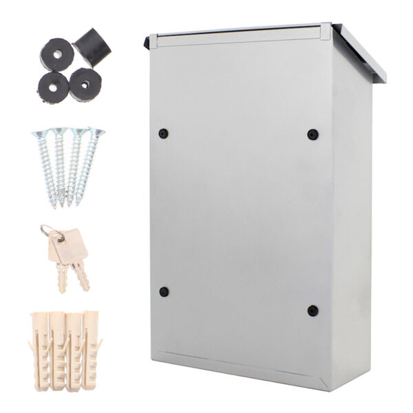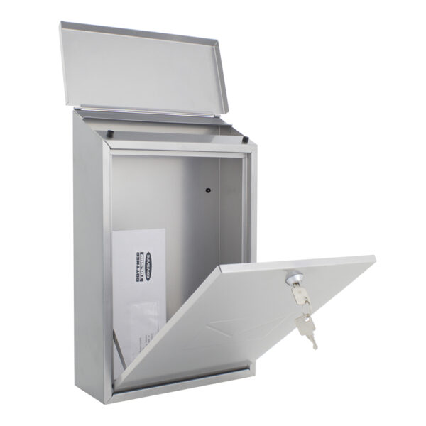 Der silberfarbene Rottner Briefkasten Parma besticht mit seinem hochwertigen Material und der eleganten Bauweise. Mit einer abgeschrägten Klappe und der zarten Prägung in Form eines Kuverts an der Tür wirkt sein Design klassisch elegant. Die Tür mit dem untenliegenden Anschlag lässt sich durch das Zylinderschloss leicht öffnen. Zur einfachen Montage des Briefkastens aus Stahlblech befinden sich das passende Montagematerial und eine Bohranleitung im Lieferumfang.