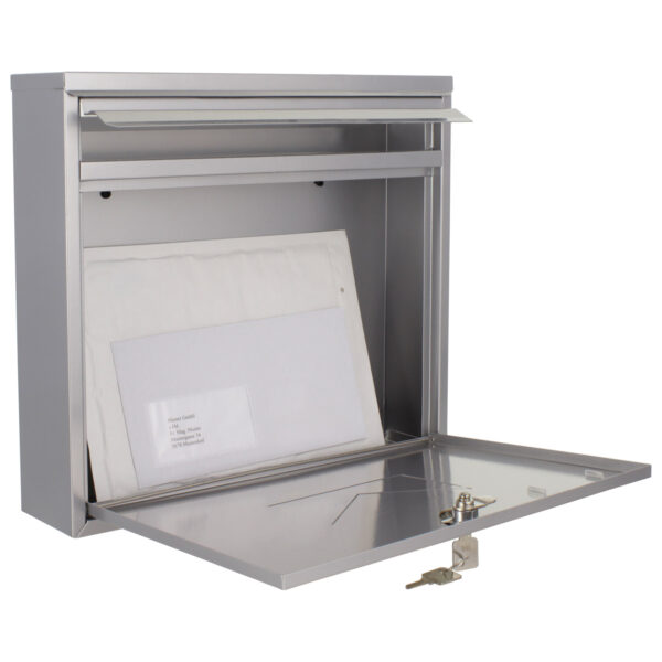 Ein wunderbarer Blickfang ist der silberfarbene Rottner Briefkasten Teramo aus Stahl. Sein Korpus mit den beidseitigen Postschlitzen wurde aus pulverbeschichtetem Stahlblech geformt und beweist, dass praktische Handhabung und zeitloses Design einander nicht ausschließen. An der Klappe befindet sich eine kleine Tropfnase. Ihr Namensschild kommt rechts oben in den dafür vorgesehenen Namensschildhalter.