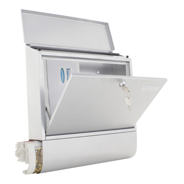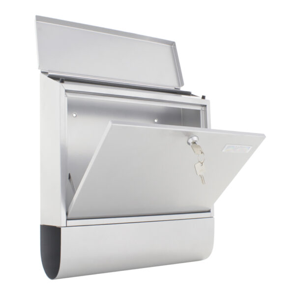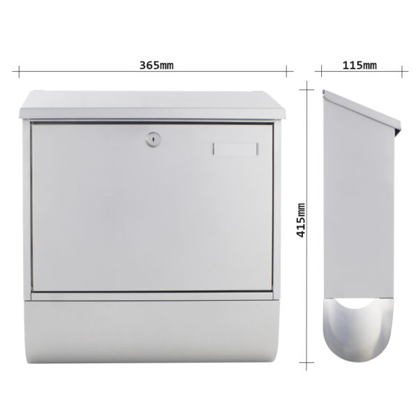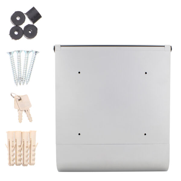 Das silberfarbene Rottner Briefkasten Villa Spezial Set wertet optisch jeden Eingangsbereich auf. Der aus pulverbeschichtetem Stahlblech gebaute Briefkasten wird durch eine formschöne halbrunde Postrolle ergänzt. An der Türe mit untenliegendem Türanschlag finden Sie in einem Namensschildhalter auch Platz für Ihr persönliches Namensschild. Die leicht abgeschrägte Klappe besitzt eine kleine Tropfnase. Das für die einfache Montage benötigte Material finden Sie im Lieferumfang vor.