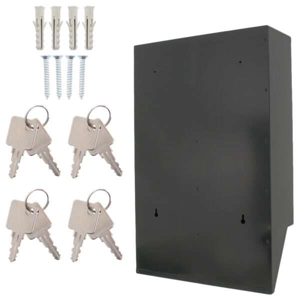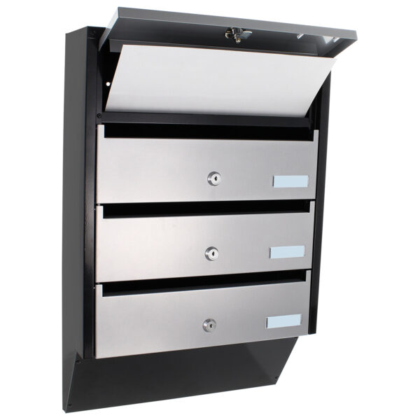Die 4-er Briefkastenanlage DEPOT 4 Silber Schwarz besticht durch die besonders schlanke Konstruktion. Das Postgut bis Größe DIN C4 wird schräg nach unten im Briefkasten gelagert. Durch diese ausgeklügelte Konstruktion ist diese Anlage speziell in engen Stiegenhäusern extrem platzsparend. Eine Anlage verfügt über 4 Fächer für vier Parteien. Jedes Fach ist mit einem Kunststoff-Namensschild ausgestattet und ist mittels Zylinderschloss vor unbefugtem Zugriff geschützt. Zu jedem Fach werden zwei Schlüssel mitgeliefert. Durch die nach oben öffnenden Entnahmetüren ergibt sich der Vorteil, dass die Türe auch im nicht versperrtem Zustand immer am Korpus anliegt und nicht als gefährliches Hindernis nach vorne steht. Sie können die Anlage seitlich beliebig erweitern (Immer in vierer Schritten). Die Anlage ist für die Wandmontage konzipiert und wird mit Befestigungsmaterial für Mauerwerk geliefert. Der Korpus ist Schwarz und die Türen Silber pulverbeschichtet.