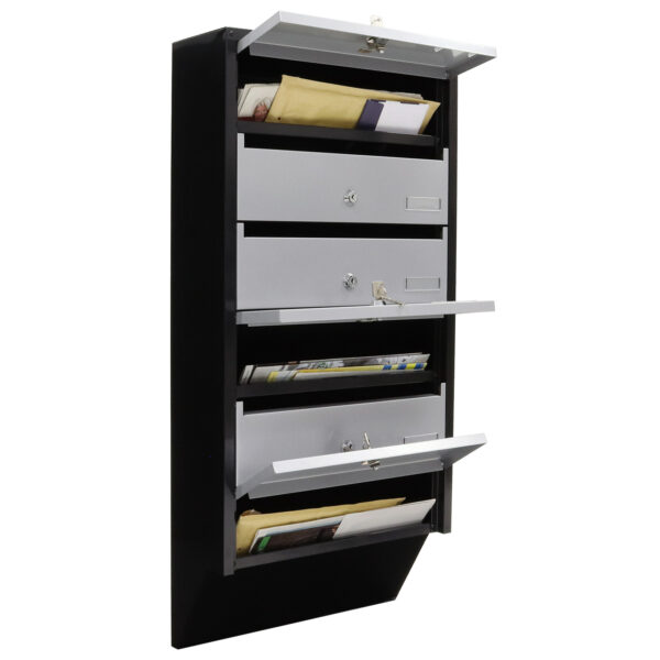Die 6-er Briefkastenanlage DEPOT 6 Silber Schwarz besticht durch die besonders schlanke Konstruktion. Das Postgut bis Größe DIN C4 wird schräg nach unten im Briefkasten gelagert. Durch diese ausgeklügelte Konstruktion ist diese Anlage speziell in engen Stiegenhäusern extrem platzsparend. Eine Anlage verfügt über 6 Fächer für sechs Parteien. Jedes Fach ist mit einem Kunststoff-Namensschild ausgestattet und ist mittels Zylinderschloss vor unbefugtem Zugriff geschützt. Zu jedem Fach werden zwei Schlüssel mitgeliefert. Durch die nach oben öffnenden Entnahmetüren ergibt sich der Vorteil, dass die Türe auch im nicht versperrtem Zustand immer am Korpus anliegt und nicht als gefährliches Hindernis nach vorne steht. Sie können die Anlage seitlich beliebig erweitern (Immer in sechser Schritten). Die Anlage ist für die Wandmontage konzipiert und wird mit Befestigungsmaterial für Mauerwerk geliefert. Der Korpus ist Schwarz und die Türen Silber pulverbeschichtet.