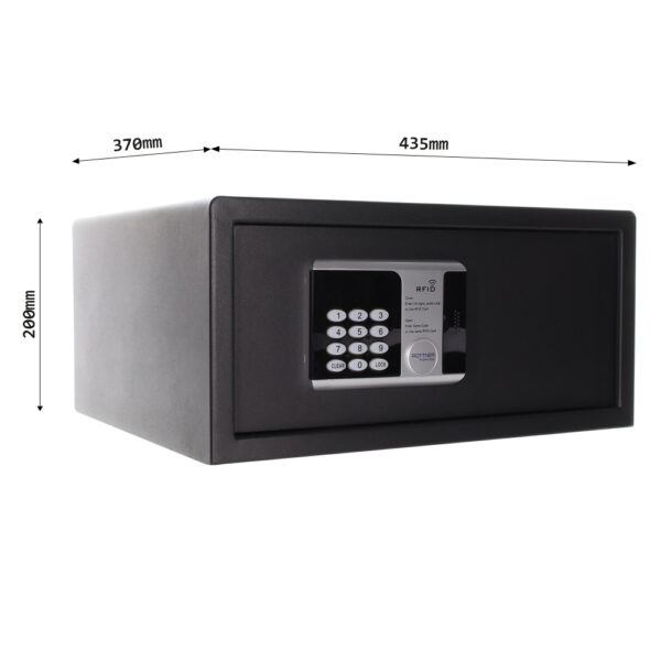 Der RFID SAFE LAP gleichsperrend eignet sich besonders gut für den Hotelbereich, aber auch für private Zwecke. Das Elektronikschloss lässt sich mit jeder Karte, die über einen RFID-Chip verfügt, öffnen oder kann mit einem Zahlencode bedient werden. Eine elektronische Notöffnung ist mittels Mastercode, eine mechanische Notöffnung mittels Schlüssel möglich. Nach vier Fehleingaben findet eine Sperrzeit von 5 Minuten statt. Die nötigen Batterien sind nicht im Lieferumfang enthalten. Auch das Display lässt sich ausschalten. Der Innenbereich ist beleuchtet. Ihre Versicherungswerte klären Sie bitte mit Ihrem Versicherungsberater ab. Das Öffnen und Schließen der Bolzen funktioniert automatisch, da kein Drehgriff vorhanden ist. Ein Laptop lässt sich im Tresor unterbringen.