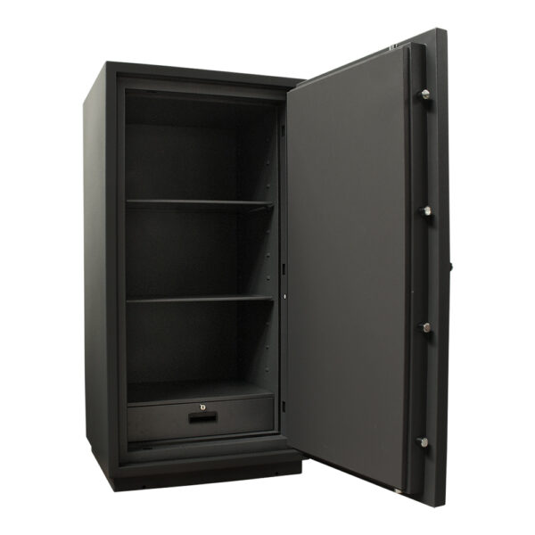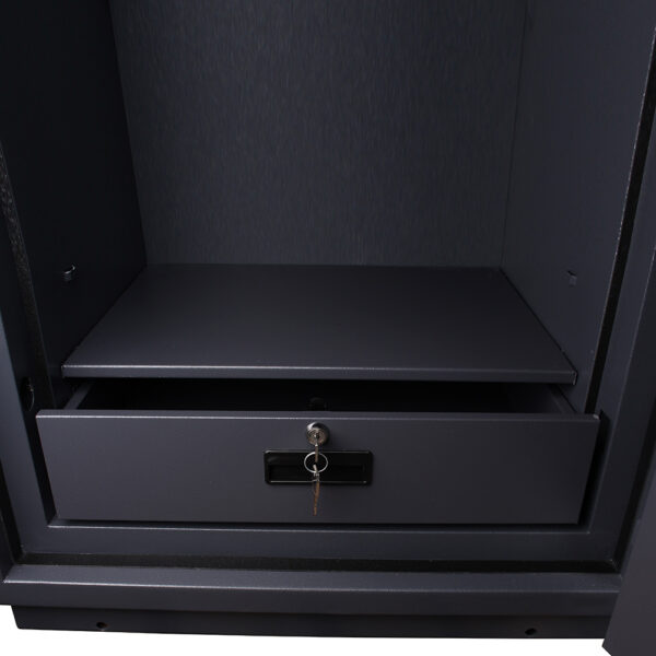 Ihnen ist vor allem der Feuerschutz bei einem Tresor wichtig? Beim Sydney 140 sind Ihre Papierdokumente 60 Minuten lang vor Hitze/Feuer sicher, da er mit speziellen Feuerschutzmaterialen gefüllt ist. Doch dies ist nur ein Plus des hochwertigen Tresors. Das Elektronikschloss kann bei einem Öffnungsproblem auch elektronisch notgeöffnet werden/Mastercode. Besonders interessant ist auch die Inneneinrichtung, die aus zwei Fachböden und einer versperrbaren Lade aus Stahl für Kleinigkeiten besteht. Bis zu 17 Ordner können Sie in diesem geräumigen Safe unterbringen.