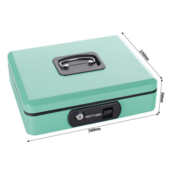 Die moderne Geldkassette Pro Box Two in der Trendfarbe Türkis überzeugt auf der ganzen Linie. Hauptverwendungszweck ist das ordentliche und übersichtliche Aufbewahren von Geldscheinen und Münzen im Geldeinsatz. Wenn Sie diesen entfernen, kommt ein Kunststoffboden zum Vorschein. Schmuck oder kleine Wertgegenstände können somit ebenfalls in der hübschen Box aufbewahrt werden. Auf der Oberseite befindet sich ein versenkbarer Griff, mit dem die Geldkassette leicht transportiert werden kann. Bei einfachem Knopfdruck öffnet sich die Kassette automatisch.