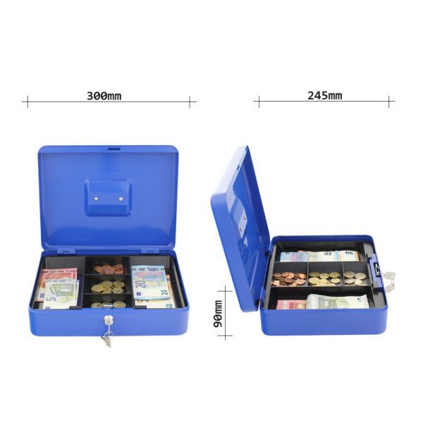 Die blaue Geldkassette Traun 4 der Marke Rottner Tresor, überzeugt mit ihrem zeitlosen und schlichten Design und der einzigartigen Qualität. Das Gehäuse und der Deckel sind aus hochwertigem Qualitäts Stahlblech gefertigt und durch ein starkes und stabiles Scharnier miteinander verbunden. Der Geldeinsatz hat die Farbe Schwarz. 2 Schlüssel sind im Lieferumfang enthalten.