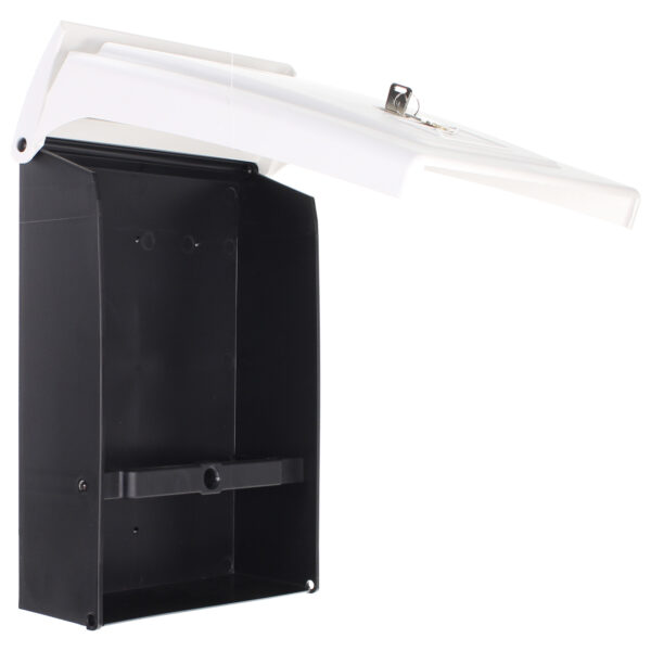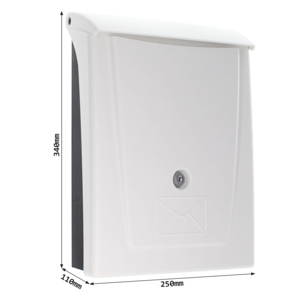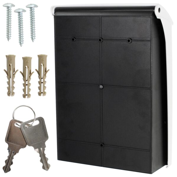Die Posta Mailbox Black-Wight aus UV-beständigem Kunststoff wird der neue Blickfang Ihres Zuhauses. Die elegante Farbkombination schwarz/weiß fällt sofort auf. Wenn Sie das Zylinderschloss öffnen (inkl. 2 Schlüssel), geht die Tür nach oben auf. Die darin befindliche Post wird mittels eines Postbefestigungshalters festgehalten, sodass sie nicht herausfallen kann. Das für die Montage benötige Befestigungsmaterial liegt bei.