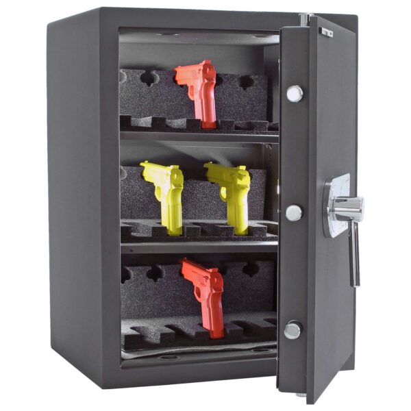 Der geprüfte mehrwandige Kurzwaffentresor EN-1 KWT- 65 eignet sich perfekt zur sicheren Aufbewahrung von Kurzwaffen und Munition in unbegrenzter Menge und bietet einen Schutz vor leichten Bränden. Die Kurzwaffen können in 3 Schaumstoffwaffenhaltern fixiert werden, so können sie nicht herausfallen. Ihr Tresor besitzt ein Doppelbart-Hochsicherheitsschloss mit 2 Schlüssel. Als besonderes Plus werden 2 Waffenschlösser gratis mitgeliefert. Auf zwei verstellbaren Fachböden können Sie Ihre Wertgegenstände verteilen. Der Kurzwaffentresor EN-1 KWT-65 ist wirklich ein kompakter Waffenschrank, wie Sie sich ihn wünschen.