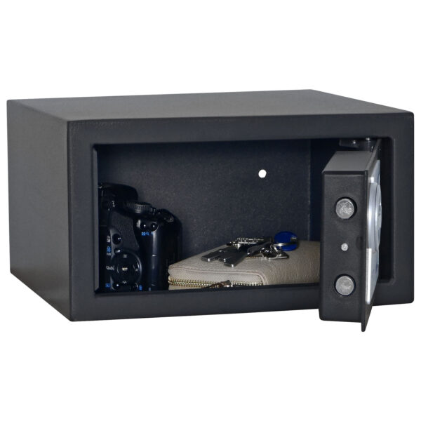 Jupiter 2 von Rottner Tresor heißt dieser kompakte Möbeltresor, der in jede noch so kleine Wohnung oder Hotelzimmer passt. Er wird in ein Möbelstück Ihrer Wahl – Schrank, Kommode, Schreibtisch – integriert und mit dem Verankerungsmaterial befestigt. Die durchgeführten Rückwand- und Bodenbohrungen erleichtern Ihnen die Montage. Auf der Bodenseite befindet sich eine Filzeinlage, die Ihre Wertgegenstände schützt. Das bedienerfreundliche Elektronikschloss kann bei Problemen mit einem Notschlüssel geöffnet werden. Der kleine Möbeltresor kann problemlos bei einem Umzug mitgenommen werden. Die Serie Jupiter gibt es in unterschiedlichen Größen und Schlossvarianten.