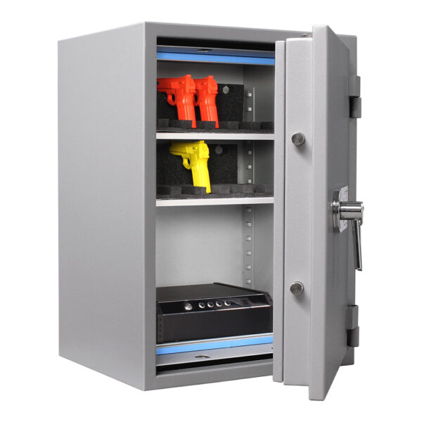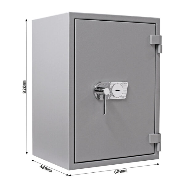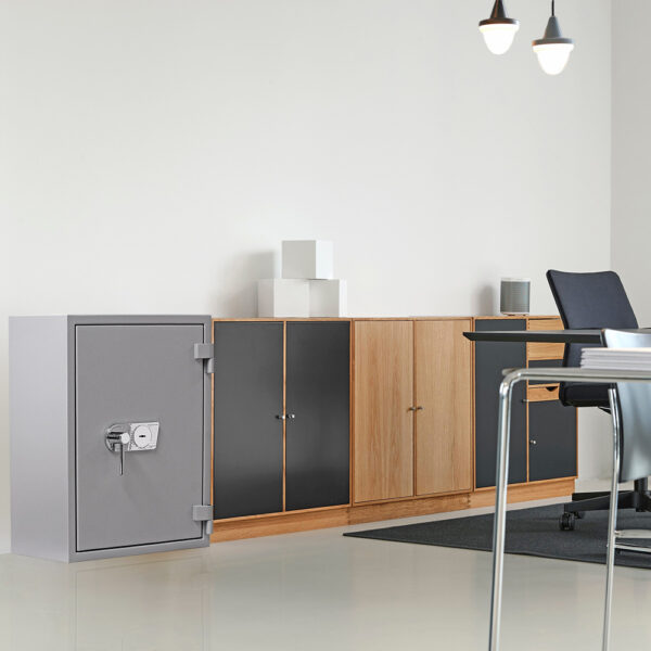 Der Rottner Papiersicherungsschrank EN1 Super Paper 80 Premium überzeugt unsere Kunden durch sein schlichtes Aussehen und seine Funktionalität. Dieses Modell verfügt über eine geprüfte Einbruchsicherheit der Klasse VdS-1 sowie einen geprüften Feuerschutz der Klasse S 60 P, beste Voraussetzungen für Sicherheit im Büro. 14 Ordner können Sie auf zwei verstellbaren Fachböden unterbringen.