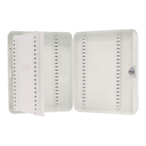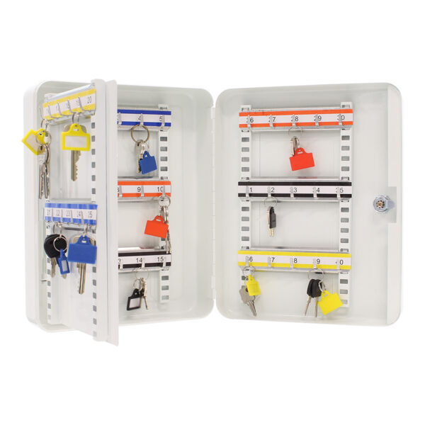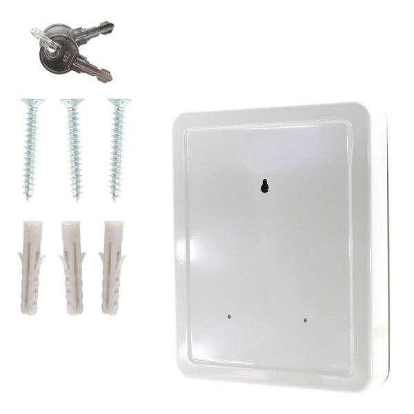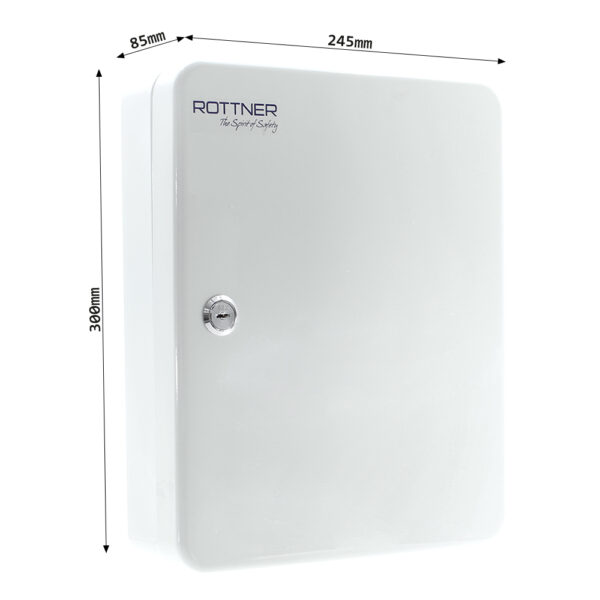 Viel Platz für Ihre Schlüssel und doch kompakt, das ist die Schlüsselkassette SK 40 von Rottner Tresor. Die schwenkbare Zwischenwand erleichtert das Auffinden der Schlüssel, ebenso die Durchnummerierung und die farblichen Leistenetiketten. So gelingt eine perfekte Übersicht. Der Schlüsselkasten wird mit einem Zylinderschloss inkl. 2 Schlüssel ergänzt und ist für die Wandmontage vorgesehen, inkl. Material.