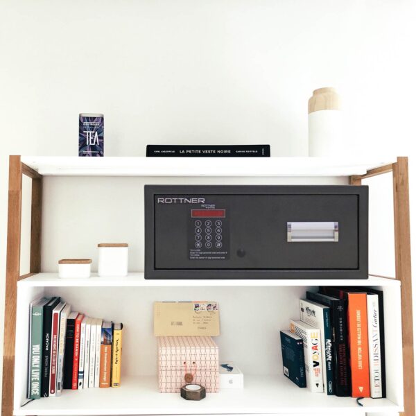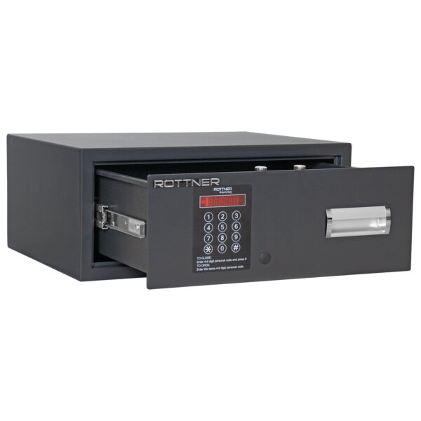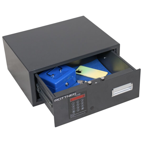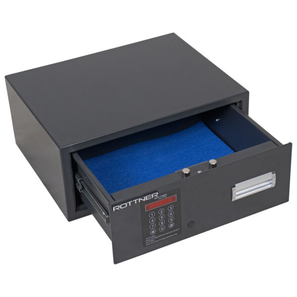 Sie suchen einen zuverlässigen Schubladentresor mit Elektronikschloss? Für Zuhause oder für den Hotelbetrieb? Dann liegen Sie mit dem MOTION 1 genau richtig. Verschließen Sie Ihre Utensilien und Wertgegenstände zuverlässig und schützen Sie sie vor ungewollten Zugriffen. Der Rottner Schubladentresor Motion 1 hat eine kompakte Größe und schützt mit dem Feuerfalz vor leichten Bränden. Das Elektronikschloss kann auch mit einem Mastercode und einer mechanischen Notöffnung geöffnet werden. Die Schublade kann vor dem Bohren entfernt werden. Sie läuft auf zwei Metallschienen, die durch Plastiksperren gesichert sind. Durch Drücken der Sicherheitssperren löst sich die Sperre und die Lade kann entnommen werden.