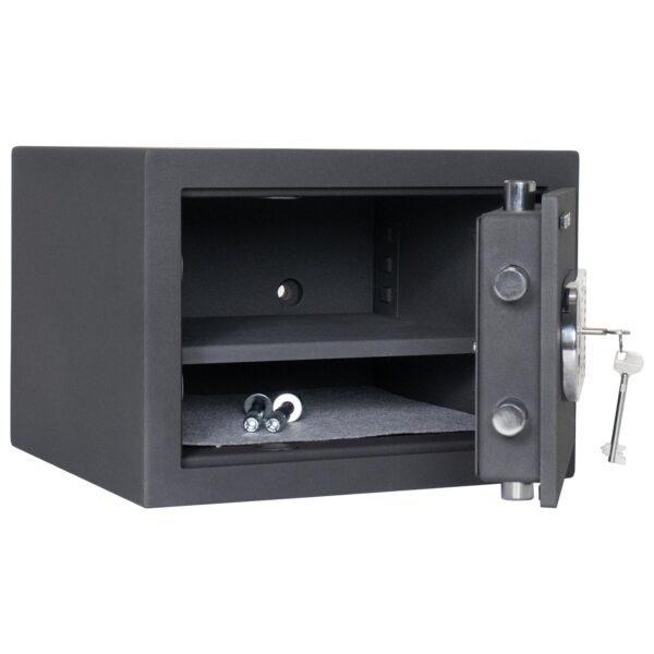 Der Rottner Wertschutzschrank Toscana 40 ist ein kleiner, der Sicherheitsstufe EN-1 nach CSN EN-1 1143-1 entsprechender Tresor mit bedingtem Feuerschutz durch ringsumlaufenden Feuerfalz. Eine einfache Handhabung verspricht das Doppelbartschloss mit Aufbohrschutz inkl. 2 Schlüssel. Für den leichten Überblick über die Wertgegenstände und Dokumente in seinem Inneren sorgt der verstellbare Fachboden – bis zu 2 Ordner finden Platz. Auch die Lagerung von Kurzwaffen ist aufgrund der Sicherheitsstufe erlaubt. Mit dem Toscana 40 haben Sie den optimalen Schutz für Ihre Dokumente und Wertpapiere.