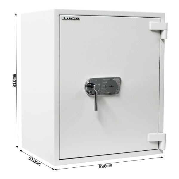 Der Rottner Wertschutzschrank EN 2 Diamant Fire Premium PO 80 mit Doppelbartschloss besitzt nicht nur einen geprüften Einbruchschutz, sondern auch einen 30-minütigen Schutz vor Feuer. Der massive Dokumentenschrank mit seinem herausnehmbaren Innentresor und seinen zwei verstellbaren Fachböden bietet für bis zu 16 Ordner oder diverse Bürounterlagen, Polizzen und Dokumente Platz. Ein herausnehmbarer Innentresor hat den Vorteil, dass der Platz auch anderweitig genützt werden kann. Sie können also entweder Kleinigkeiten in den Innentresor geben oder z.B. anstelle des Innentresors Ordner etc. unterbringen. Der Innentresor ist angeschraubt und lässt sich im versperrten Zustand nicht herausheben. Dies geht nur, wenn er geöffnet ist und Sie die diesbezüglichen Schrauben herausdrehen. Das für die Bodenverankerung benötigte Material finden Sie im Lieferumfang des Tresors vor. Vorbereitungen für eine Einbruchmeldeanlage sind durchgeführt.