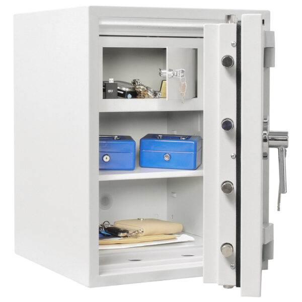 Der Rottner feuersichere Wertschutzschrank EN3 Diamant Super Fire Premium DO65 überzeugt mit seinem Einbruchschutz, einem 30-minütigen Schutz vor Feuer (Papier) und der EMA (Einbruchmeldeanlagen)-Vorbereitung! Der robuste Wertschutzschrank ist mit einem Fachboden und einem herausnehmbaren Innentresor (190 mm hoch) perfekt ausgestattet. Es können bis zu 7 Ordner, Dokumente, Reisepass, Fotoalben etc. aufbewahrt werden. Für die fachgerechte Bodenverankerung ist das Material im Lieferumfang enthalten, ebenso die beiden Schlüssel zum Doppelbartschloss.